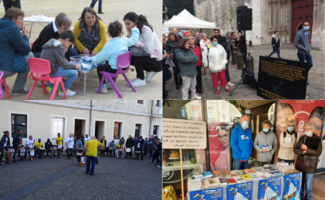 De nombreux militants Quart Monde ont également pris la parole partout en France. À Angers, des ateliers ont été organisés avec les enfants pour dessiner des bateaux. À Rouen, une déambulation en musique a rassemblé une centaine de personnes qui se sont rendues place de la Cathédrale pour poser une réplique de la Dalle du Trocadéro, entourée d’un cercle de silence. Ambiance festive également à Chambéry, au son des djembés et avec la lecture d’un recueil de poésies, ou encore à Villeneuve-sur-Lot, avec un stand installé sur le marché, le 16 octobre.